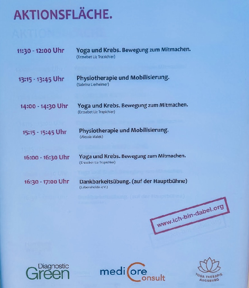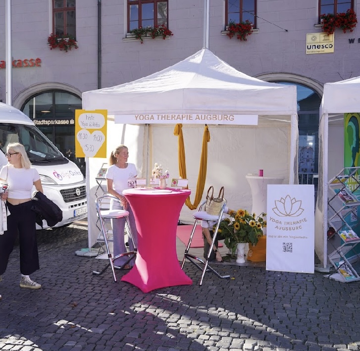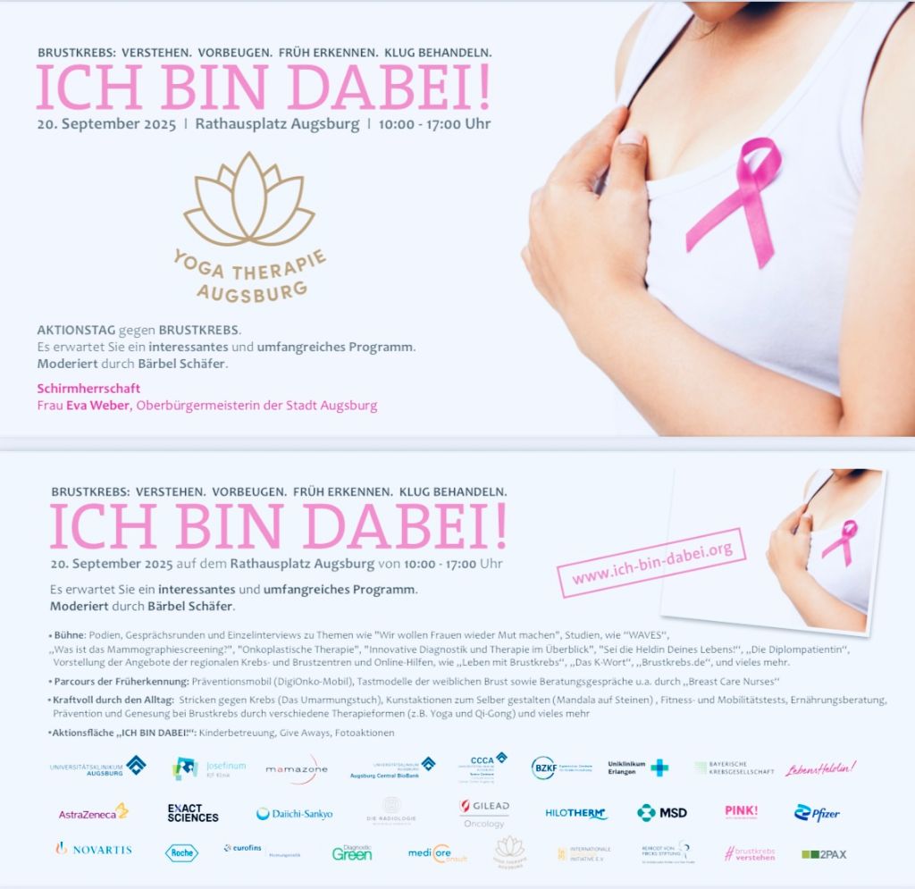 Am 20. September 2025 haben wir als Yoga Therapie Augsburg den Brustkrebstag auf dem Rathausplatz mitgestaltet – an der Seite der Stadt Augsburg, dem CCCK, dem Universitätsklinikum, dem Josefinum, Lebensheldinnen und vielen weiteren engagierten Akteur:innen. Unsere Bilder zeigen mehr als Momente – sie zeigen Begegnungen. Fundiertes Yogatherapie, ausgerichtet nach den S3-Leitlinien für Komplementärmedizin in der Onkologie, getragen von Erfahrung, Empathie und echter Verbindung.
